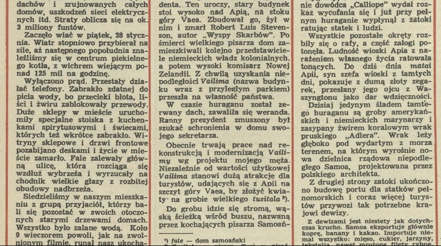 Archiwum / korespondencja własna "Przekroju" nr 1122 (41/1966) 1/5 Podziel się Tytuł Orkan na Samoa Autor Ewa Wolak Rubryka korespondencja własna "Przekroju" Artykuł z numeru 1122 (41/1966) Data wydania 9 października 1966 Tagi Apia wyspa Upolu Samoa orkan