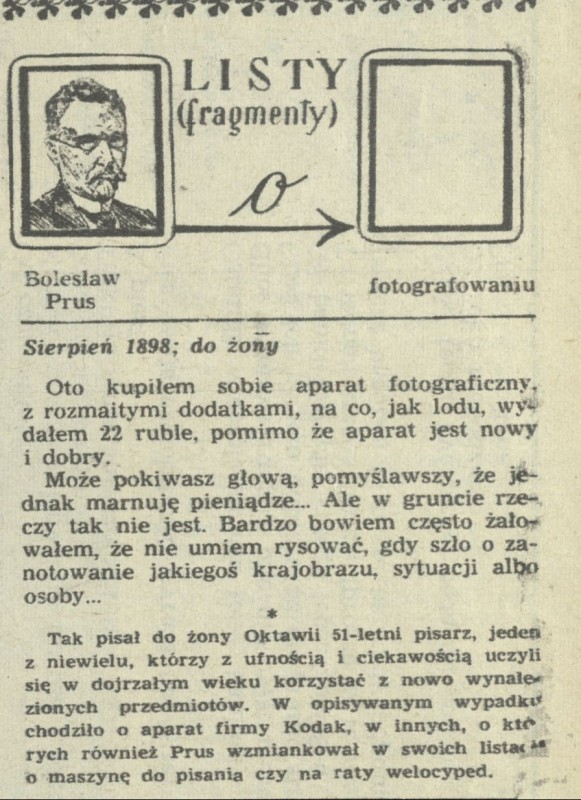 Archiwum / Listy sławnych ludzi nr 1374 (32/1971) 2/2 Podziel się Tytuł Bolesłąw Prus o fotografowaniu Rubryka Listy sławnych ludzi Artykuł z numeru 1374 (32/1971) Data wydania 8 sierpnia 1971 Tagi Bolesław Prus Oktawia Głowacka