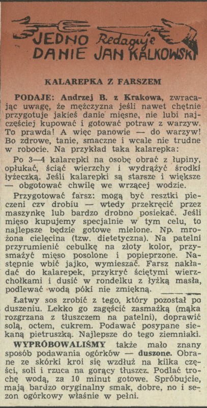 Archiwum / Jedno danie nr 953 (28/1963) 01/10 Podziel się Tytuł Kalarepka z farszem Autor Jan Kalkowski Rubryka Jedno danie Artykuł z numeru 953 (28/1963) Data wydania 14 lipca 1963 Tagi gastronomia kulinaria przepis kulinarny duszone ogórki