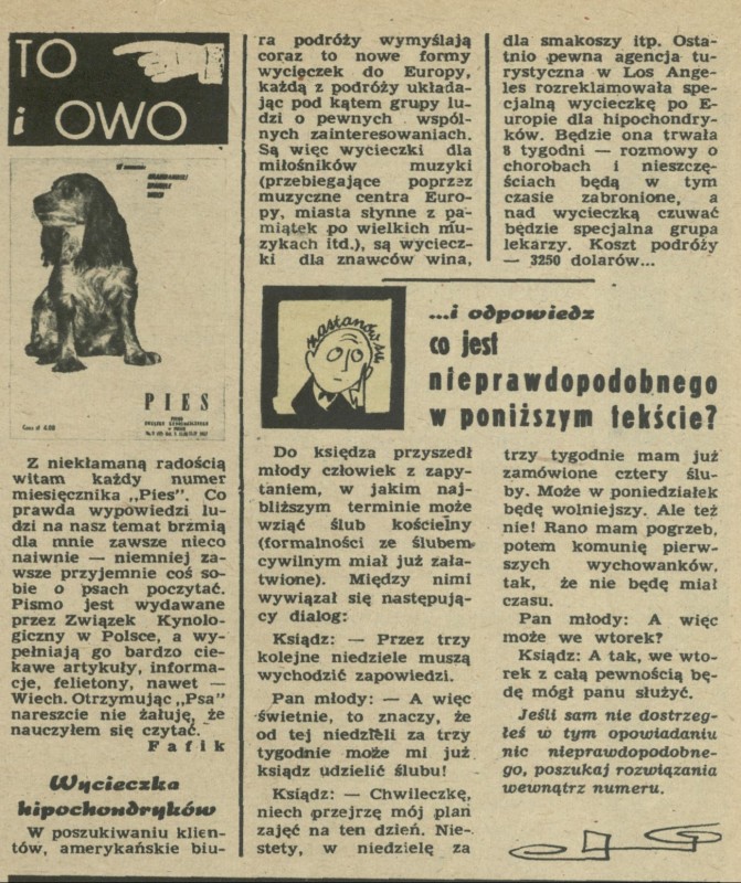 Archiwum / To i owo nr 643 (32/1957) 51/163 Podziel się Tytuł To i owo Autor Fafik Rubryka To i owo Artykuł z numeru 643 (32/1957) Data wydania 4 sierpnia 1957 Tagi pies hipochondryk