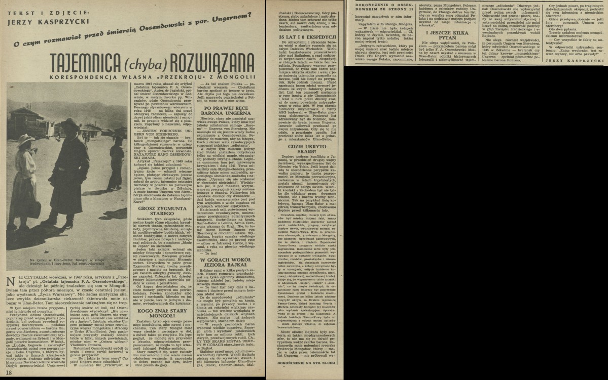 Archiwum / korespondencja własna "Przekroju" nr 643 (32/1957) 254/419 Podziel się Tytuł O czym rozmawiał przed śmiercią Ossendowski z por. Ungernem? Tajemnica (chyba) rozwiązana Autor Jerzy Kasprzycki Rubryka korespondencja własna "Przekroju" Artykuł z numeru 643 (32/1957) Data wydania 4 sierpnia 1957 Tagi Ossendowski Ungern Mongolia