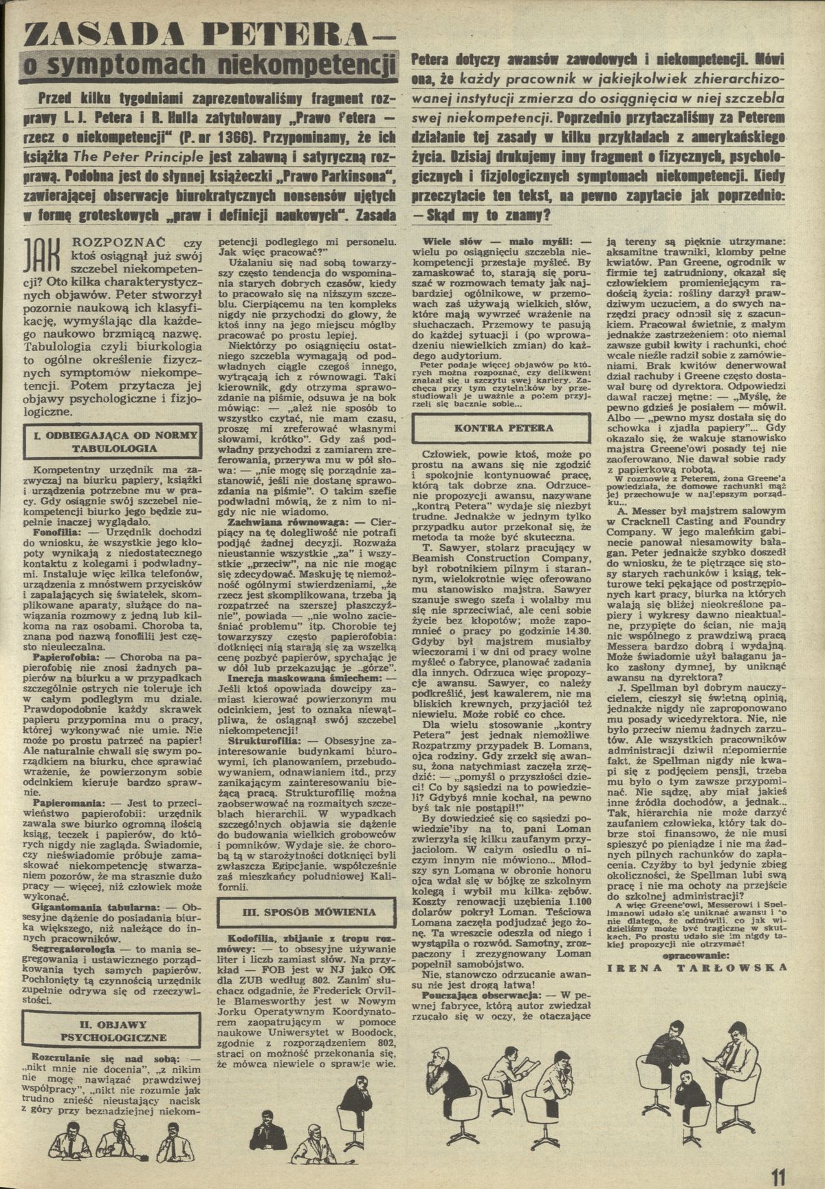 Archiwum / Artykuł nr 1375 (33/1971) 1/2 Podziel się Tytuł Zasada Petera - o symptomach niekompetencji Autor Irena Tarłowska Kategoria Artykuł Artykuł z numeru 1375 (33/1971) Data wydania 15 sierpnia 1971 Tagi prawo Petera The Peter Principle L. J. Peter R. Hull