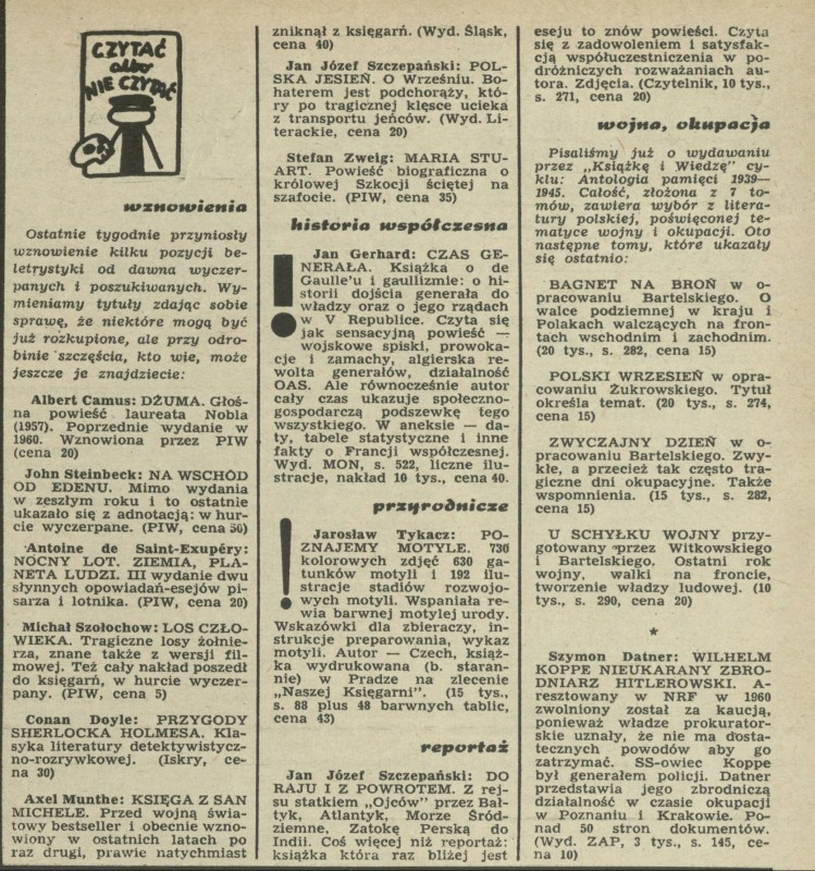 Archiwum / Czytać albo nie czytać? nr 988 (11/1964) 35/87 Podziel się Tytuł Czytać albo nie czytać? Rubryka Czytać albo nie czytać? Artykuł z numeru 988 (11/1964) Data wydania 15 marca 1964 Tagi Conan Doyle "Przygody Sherlocka Holmesa" Bartelski "Bagnet na broń" Jan Gerhard "Czas generała" Jan Józef Szczepański "Polska jesień"