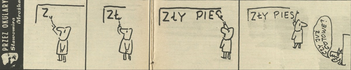 Archiwum / Przez okulary Sławomira Mrożka nr 1102 (21/1966) 107/373 Podziel się Tytuł Zły pies Autor Sławomir Mrożek Rubryka Przez okulary Sławomira Mrożka Artykuł z numeru 1102 (21/1966) Prawa Diogenes Verlag AG Data wydania 22 maja 1966 Tagi satyra absurd żart rysunkowy