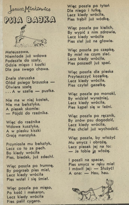 Archiwum / Poezja nr 3 (03/1945) 65/123969 Podziel się Tytuł Psia Bajka Autor Janusz Minkiewicz Kategoria Poezja Artykuł z numeru 3 (3/1945) Data wydania 29 kwietnia 1945