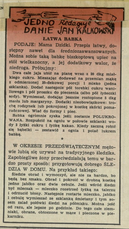 Archiwum / Jedno danie nr 988 (11/1964) 41554/123969 Podziel się Tytuł Łatwa babka Autor Jan Kalkowski Rubryka Jedno danie Artykuł z numeru 988 (11/1964) Data wydania 15 marca 1964 Tagi kulinaria gastronomia przepis kulinarny deser Wielkanoc babka biszkoptowa śledzik śledzie