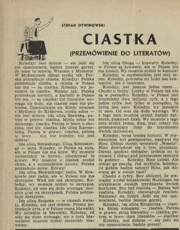 Archiwum / Opinie nr 4 (04/1945) 83/83 Podziel się Tytuł Ciastka (przemówienie do literatów) Autor Stefan Otwinowski Kategoria Opinie Artykuł z numeru 4 (4/1945) Data wydania 6 maja 1945