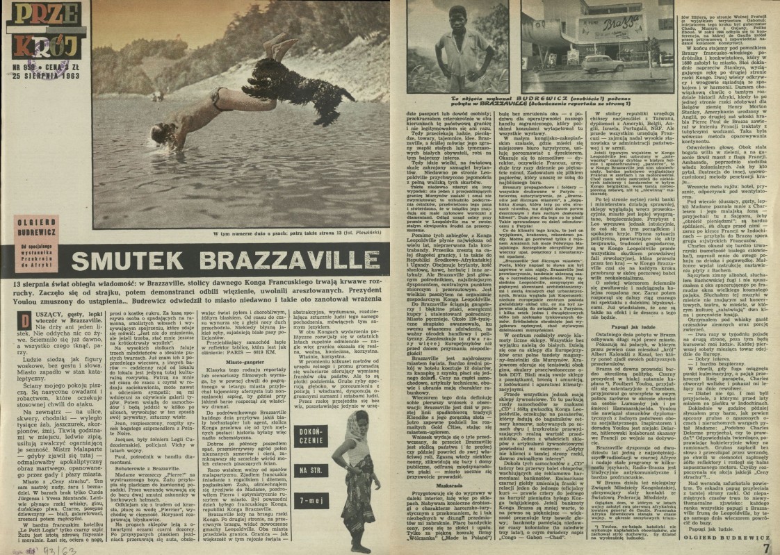 Archiwum / korespondencja własna "Przekroju" nr 959 (34/1963) 10/16 Podziel się Tytuł Smutek Brazzaville Autor Olgierd Budrewicz Rubryka korespondencja własna "Przekroju" Artykuł z numeru 959 (34/1963) Data wydania 25 sierpnia 1963 Tagi krwawe rozruchy w Brazzaville dawne Kongo Francuskie