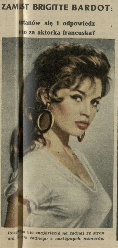Archiwum / Zastanów się nr 632 (21/1957) 15/50 Podziel się Tytuł Zamiast Brigitte Bardot Rubryka Zastanów się Artykuł z numeru 632 (21/1957) Data wydania 19 maja 1957 Tagi zagadka zgadywanka aktorka francuska
