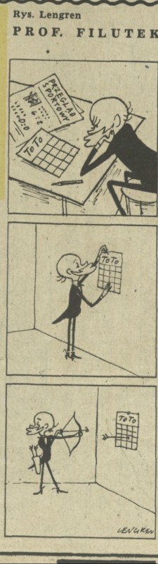 Archiwum / Profesor Filutek nr 632 (21/1957) 01/23 Podziel się Tytuł Prof. Filutek Autor Zbigniew Lengren Rubryka Profesor Filutek Artykuł z numeru 632 (21/1957) Data wydania 19 maja 1957 Tagi żart rysunkowy toto Totalizator Sportowy loteria
