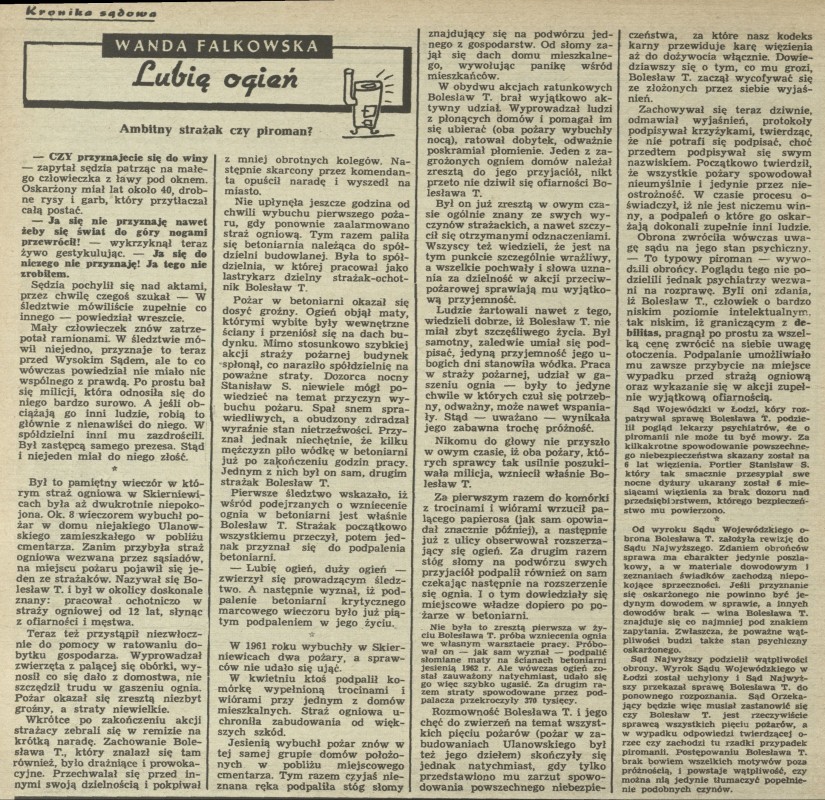 Archiwum / Kronika sądowa nr 995 (18/1964) 41789/123969 Podziel się Tytuł Lubię ogień Autor Wanda Falkowska Rubryka Kronika sądowa Artykuł z numeru 995 (18/1964) Data wydania 1 maja 1964