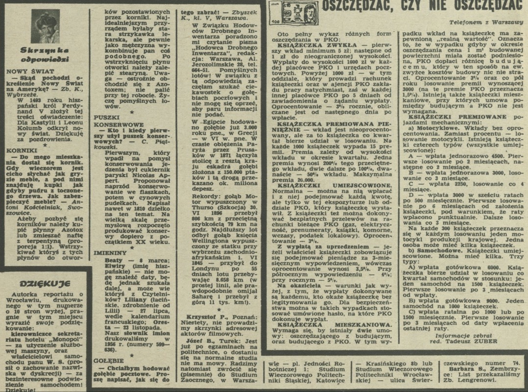 Archiwum / Skrzynka odpowiedzi nr 959 (34/1963) 83685/123969 Podziel się Tytuł Skrzynka na odpowiedzi Rubryka Skrzynka odpowiedzi Artykuł z numeru 959 (34/1963) Data wydania 25 sierpnia 1963 Tagi odpowiedzi na pytania czytelników różności