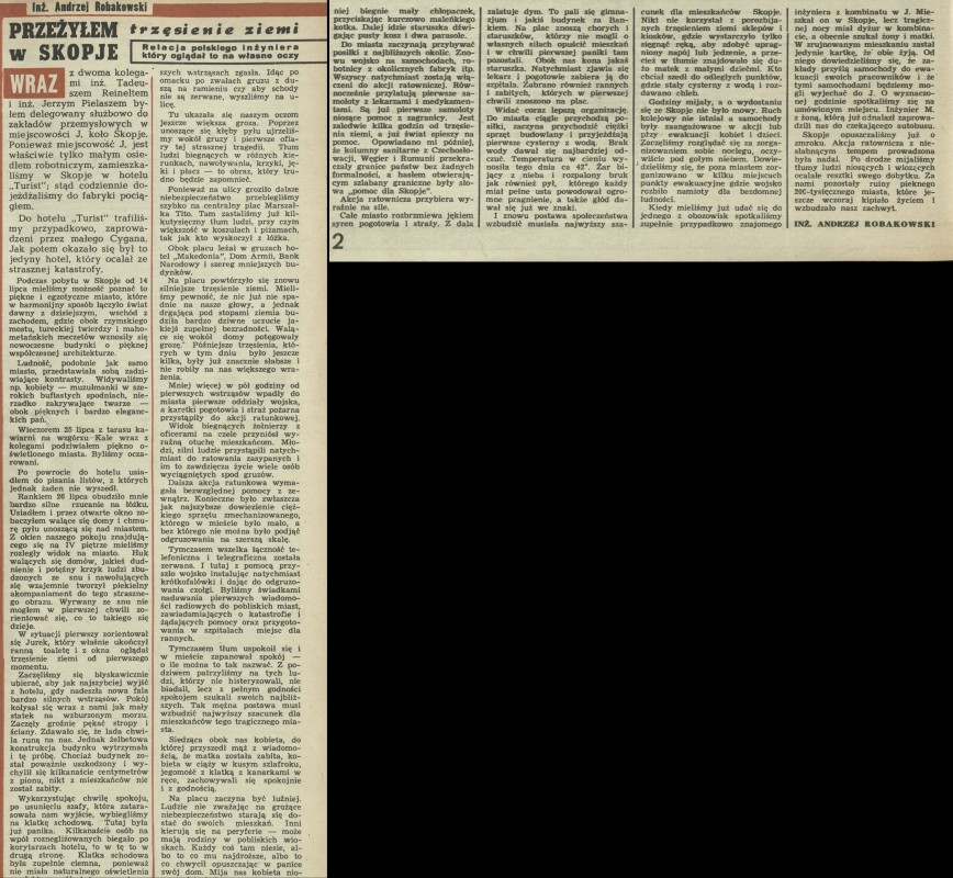 Archiwum / Relacja nr 960 (35/1963) 22/62 Podziel się Tytuł Przeżyłem trzęsienie ziemi w Skopje Autor Andrzej Robakowski Kategoria Relacja Artykuł z numeru 960 (35/1963) Data wydania 1 września 1963 Tagi trzęsienie ziemi w Skopje Jugosławia