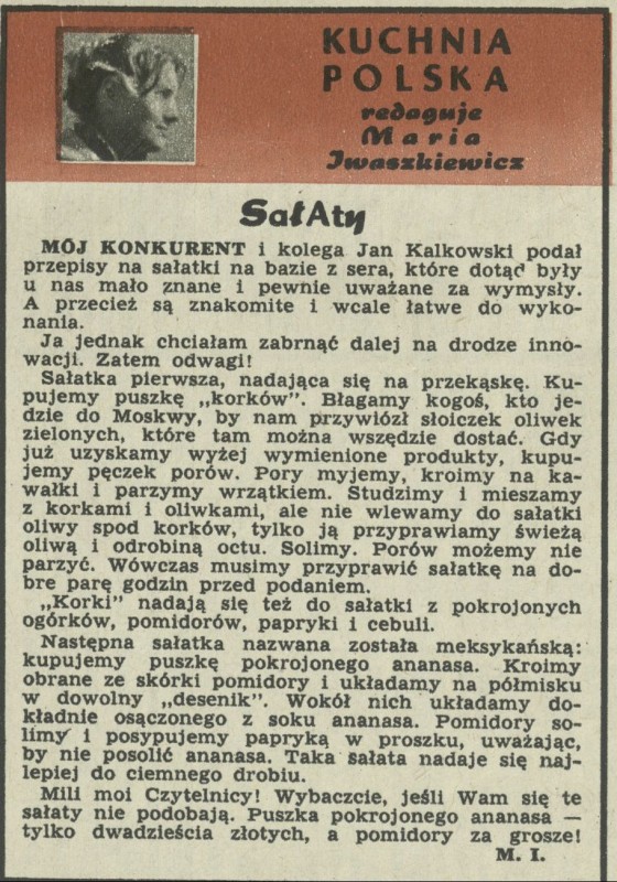 Archiwum / Kuchnia Polska nr 960 (35/1963) 89/128 Podziel się Tytuł Kuchnia polska. Redaguje Maria Iwaszkiewicz Autor Maria Iwaszkiewicz Rubryka Kuchnia Polska Artykuł z numeru 960 (35/1963) Data wydania 1 września 1963 Tagi kuchnia polska Maria Iwaszkiewicz sałaty