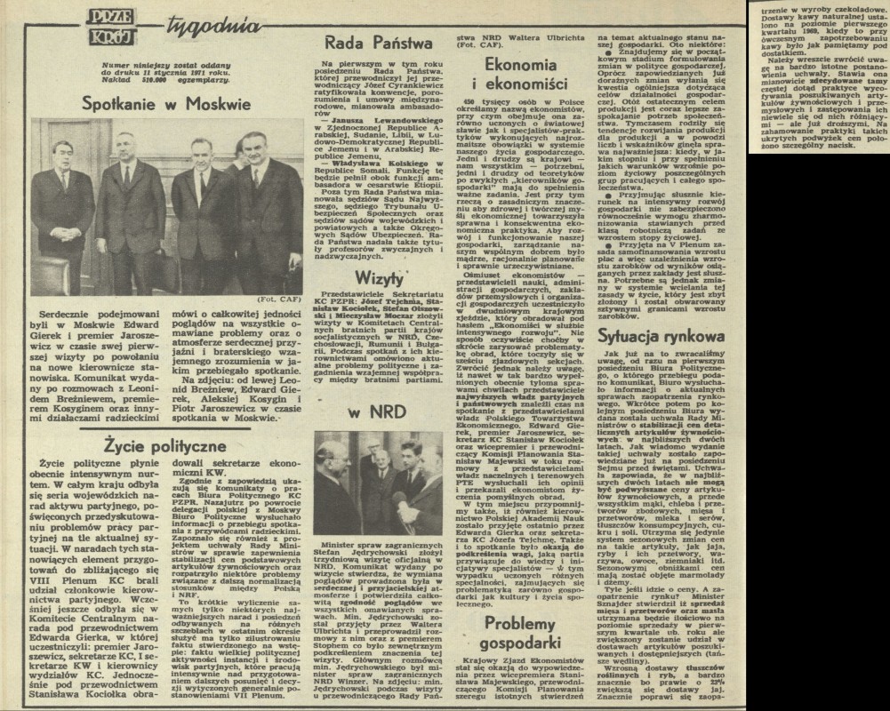 Archiwum / Przekrój tygodnia nr 1345 (03/1971) 1/1 Podziel się Tytuł Przekrój tygodnia Rubryka Przekrój tygodnia Artykuł z numeru 1345 (3/1971) Data wydania 17 stycznia 1971 Tagi Gierek Jaroszewicz polityka NRD ekonomia gospodarka ceny rynek