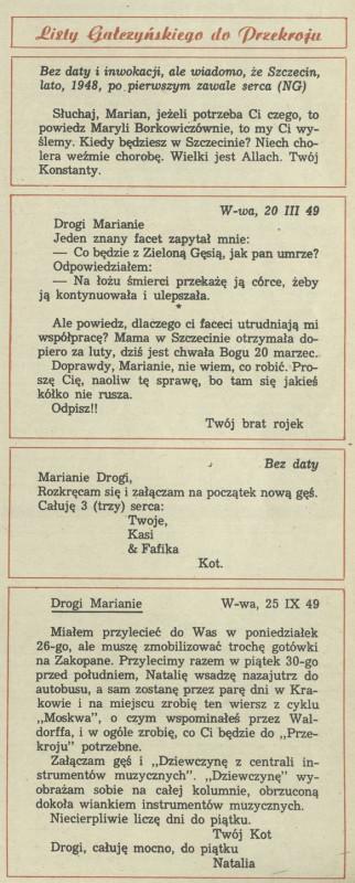 Archiwum / korespondencja własna "Przekroju" nr 1005 (28/1964) 6/6 Podziel się Tytuł Listy Gałczyńskiego do „Przekroju” Autor Konstanty Ildefons Gałczyński Rubryka korespondencja własna "Przekroju" Artykuł z numeru 1005 (28/1964) Data wydania 12 lipca 1964 Tagi Marian Eile przekrój