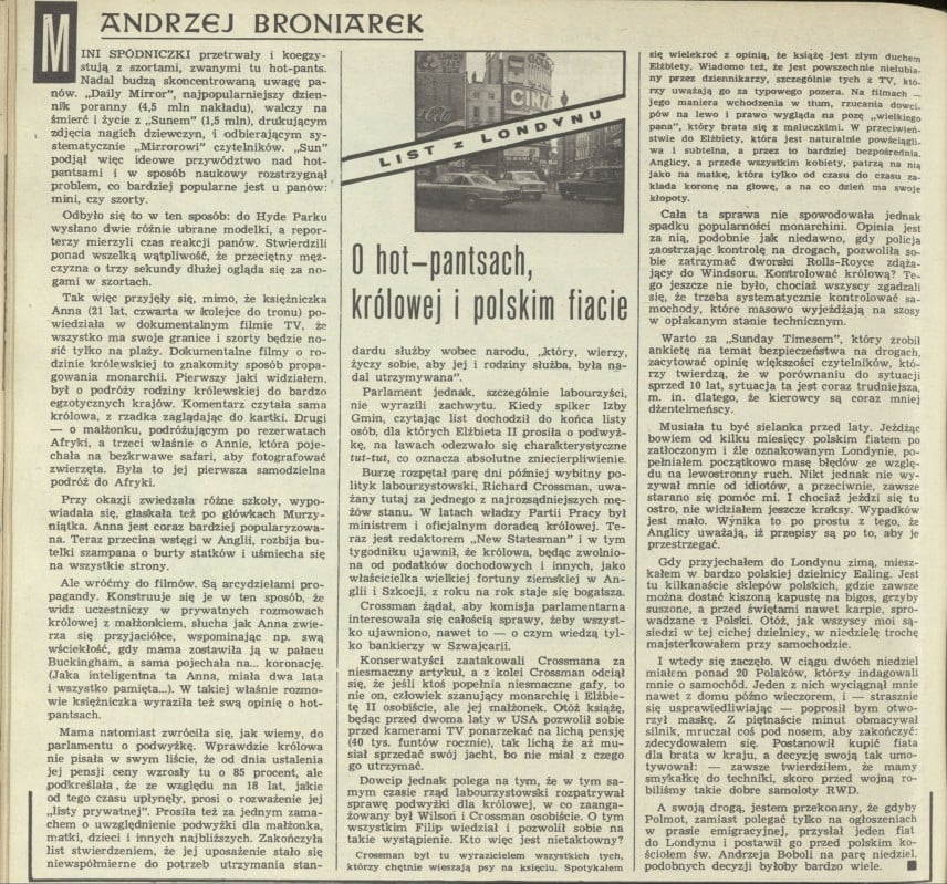 Archiwum / korespondencja własna "Przekroju" nr 1379 (37/1971) 03/53 Podziel się Tytuł O hot-pantsach, królowej i polskim fiacie Autor Andrzej Broniarek Rubryka korespondencja własna "Przekroju" Artykuł z numeru 1379 (37/1971) Data wydania 12 września 1971 Tagi Londyn Broniarek Elżbieta II fiat Hyde Park hot-pantsy