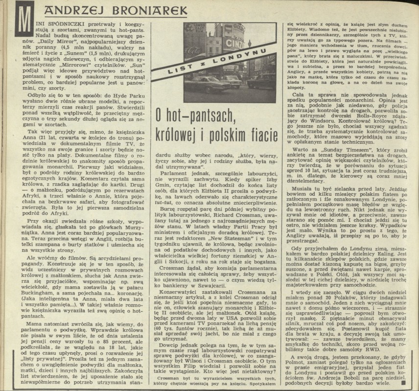 Archiwum / korespondencja własna "Przekroju" nr 1379 (37/1971) 2/3 Podziel się Tytuł O hot-pantsach, królowej i polskim fiacie Autor Andrzej Broniarek Rubryka korespondencja własna "Przekroju" Artykuł z numeru 1379 (37/1971) Data wydania 12 września 1971 Tagi Londyn Broniarek Elżbieta II fiat Hyde Park hot-pantsy