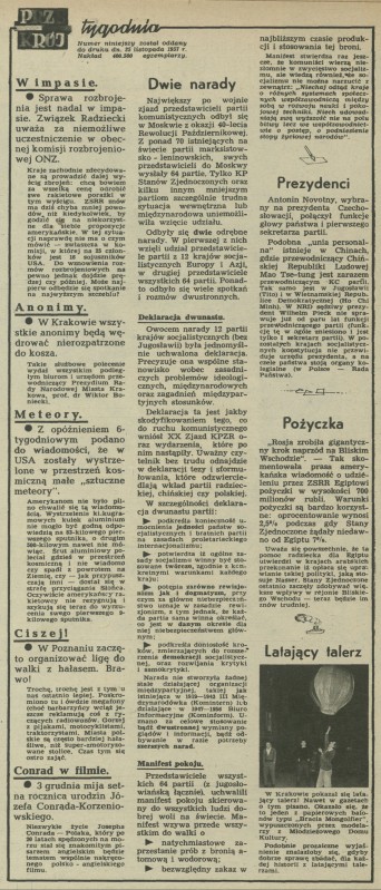 Archiwum / Przekrój tygodnia nr 660 (49/1957) 7/9 Podziel się Tytuł Przekrój tygodnia Rubryka Przekrój tygodnia Artykuł z numeru 660 (49/1957) Data wydania 1 grudnia 1957 Tagi ONZ anonimy meteory hałas deklaracja Jugosławia pokój Novotny Egipt
