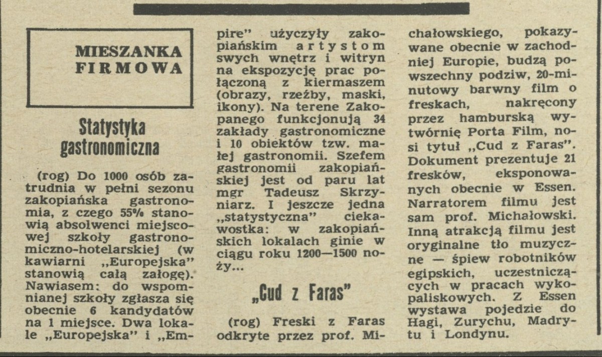 Archiwum / Mieszanka firmowa nr 1267 (29/1969) 52044/123969 Podziel się Tytuł Mieszanka firmowa Rubryka Mieszanka firmowa Artykuł z numeru 1267 (29/1969) Data wydania 20 lipca 1969 Tagi statystyka gastronomiczna Faras freski