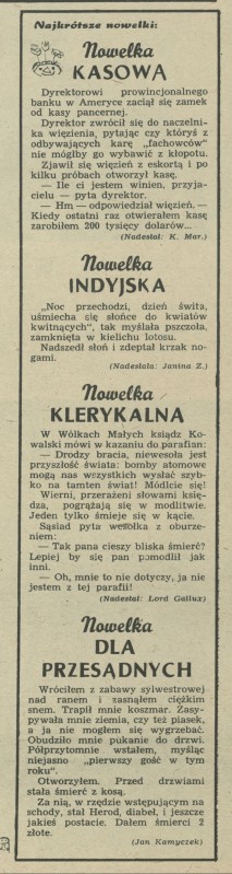 Archiwum / Najkrótsze nowelki nr 666 (02/1958) 2/2 Podziel się Tytuł Najkrótsze nowelki Autor Jan Kamyczek Rubryka Najkrótsze nowelki Artykuł z numeru 666 (2/1958) Data wydania 12 stycznia 1958 Tagi nowelka kasowa nowelka indyjska nowelka klerykalna nowelka dla przesądnych