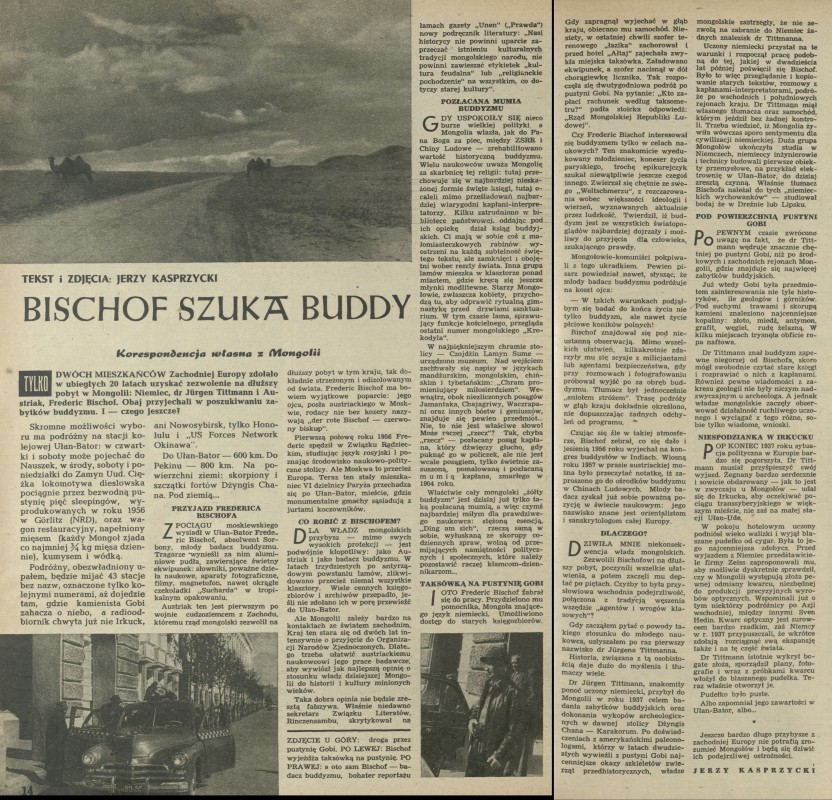Archiwum / korespondencja własna "Przekroju" nr 646 (35/1957) 55/92 Podziel się Tytuł Bischof szuka Buddy Autor Jerzy Kasprzycki Rubryka korespondencja własna "Przekroju" Artykuł z numeru 646 (35/1957) Data wydania 25 sierpnia 1957 Tagi Mongolia Frederic Bischof buddyzm zabytki buddyjskie Tittmann