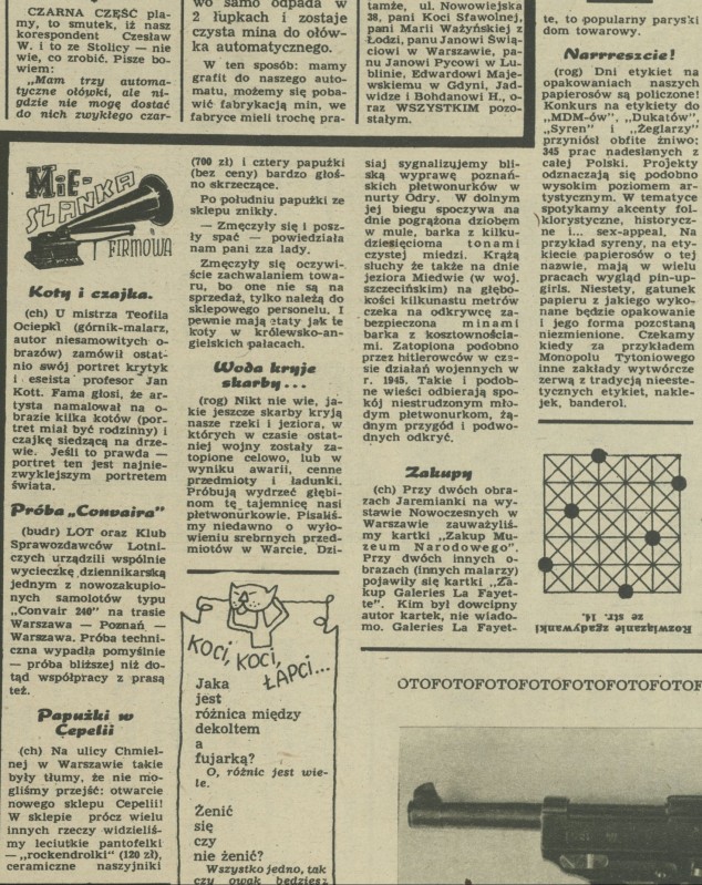 Archiwum / Mieszanka firmowa nr 660 (49/1957) 09/72 Podziel się Tytuł Mieszanka firmowa Rubryka Mieszanka firmowa Artykuł z numeru 660 (49/1957) Data wydania 1 grudnia 1957 Tagi Ociepka Kott samolot Cepelia