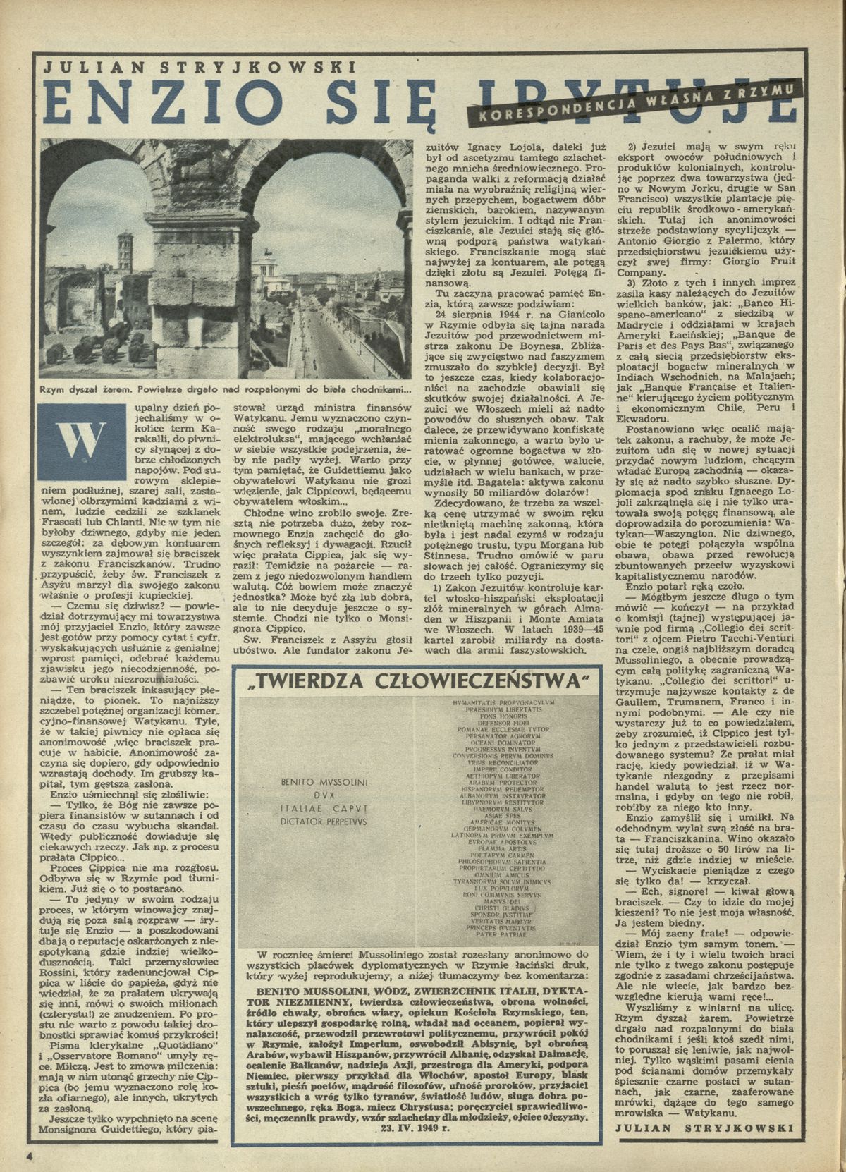 Archiwum / Opinie nr 218 (24/1949) 2/2 Podziel się Tytuł Enzio się irytuje Autor Julian Stryjkowski Kategoria Opinie Artykuł z numeru 218 (24/1949) Data wydania 12 czerwca 1949 Tagi korespondencja Włochy Rzym Benito Mussolini