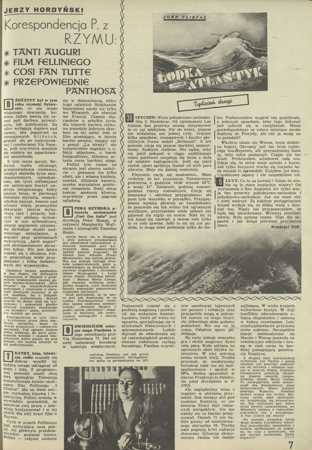 Archiwum / korespondencja własna "Przekroju" nr 1347 (05/1971) 55/857 Podziel się Tytuł Tanti auguri Autor Jerzy Hordyński Rubryka korespondencja własna "Przekroju" Artykuł z numeru 1347 (5/1971) Data wydania 31 stycznia 1971