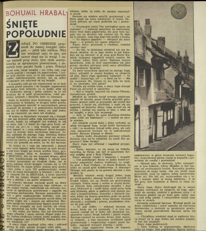 Archiwum / Opowiadanie nr 1381 (39/1971) 2/4 Podziel się Tytuł Śnięte popołudnie Autor Bohumił Hrabal Józef Waczków Kategoria Opowiadanie Artykuł z numeru 1381 (39/1971) Data wydania 26 września 1971 Tagi Hrabal opowiadanie popołudnie