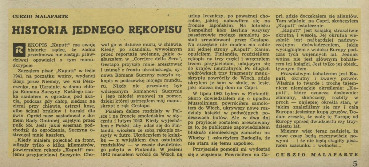 Archiwum / Komentarz nr 659 (48/1957) 32/224 Podziel się Tytuł Historia jednego rękopisu Autor Curzio Malaparte Kategoria Komentarz Artykuł z numeru 659 (48/1957) Data wydania 24 listopada 1957 Tagi "Kaputt" literatura włoska