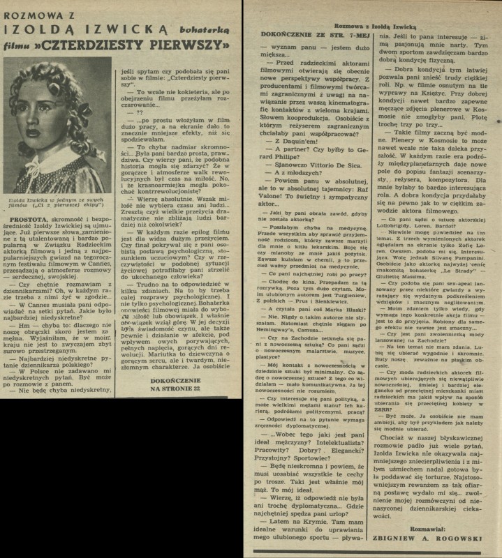 Archiwum / Film nr 659 (48/1957) 1/2 Podziel się Tytuł Rozmowa z Izoldą Izwicką - bohaterką filmu „Czterdziesty pierwszy” Autor Zbigniew K. Rogowski Rubryka Film Artykuł z numeru 659 (48/1957) Data wydania 24 listopada 1957
