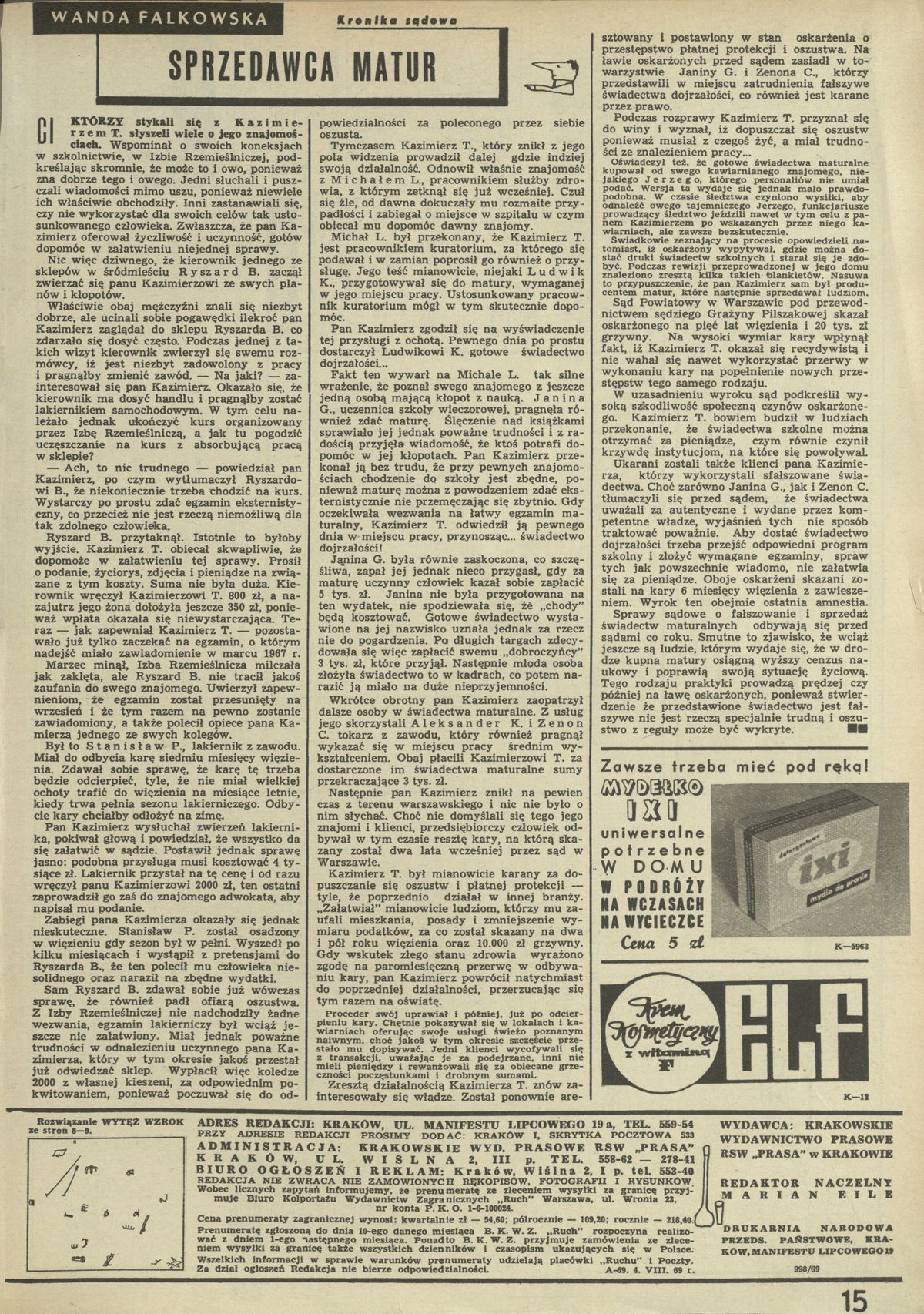 Archiwum / Kronika sądowa nr 1270 (32/1969) 20/476 Podziel się Tytuł Sprzedawca matur Autor Wanda Falkowska Rubryka Kronika sądowa Artykuł z numeru 1270 (32/1969) Data wydania 10 sierpnia 1969 Tagi matury