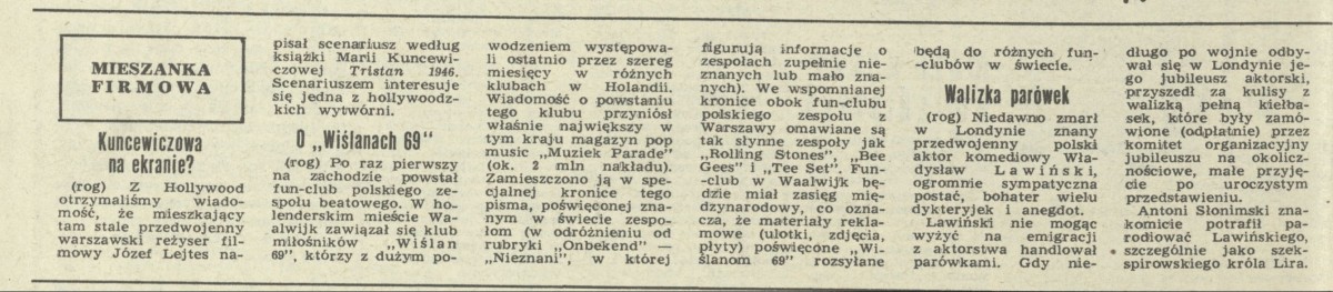Archiwum / Mieszanka firmowa nr 1383 (41/1971) 56308/123969 Podziel się Tytuł Mieszanka firmowa Rubryka Mieszanka firmowa Artykuł z numeru 1383 (41/1971) Data wydania 10 października 1971 Tagi Maria Kuncewiczowa Tristan Wislanie 69 Władysław Lawiński