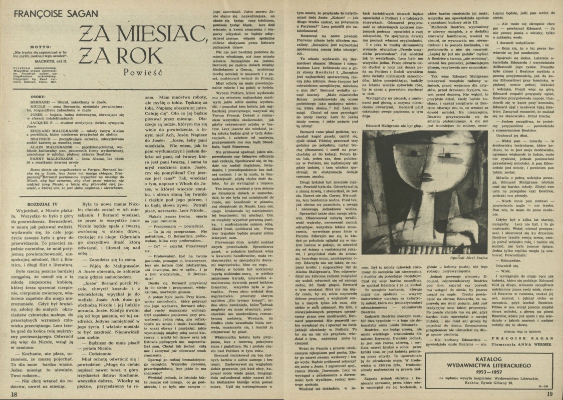 Archiwum / Proza nr 667 (03/1958) 06/30 Podziel się Tytuł Za miesiąć, za rok Autor Franciose Sagan Anna Wermer Kategoria Proza Artykuł z numeru 667 (3/1958) Data wydania 19 stycznia 1958 Tagi fragmenty powieści literatura francuska