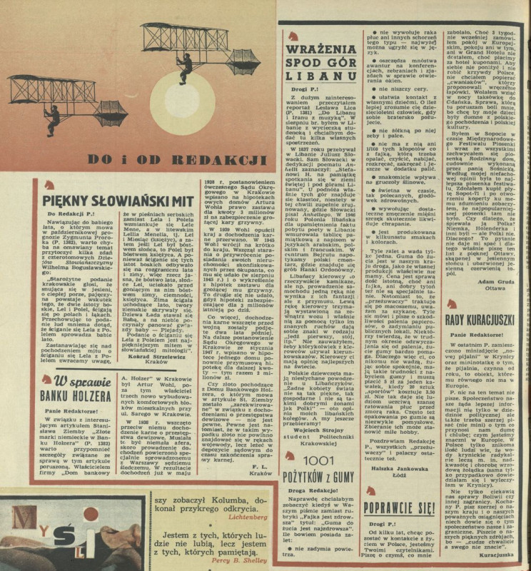 Archiwum / Listy do i od redakcji nr 1385 (43/1971) 2/2 Podziel się Tytuł Listy do i od redakcji Rubryka Listy do i od redakcji Artykuł z numeru 1385 (43/1971) Data wydania 24 października 1971 Tagi Bank Holzera góry Libanu Liban guma