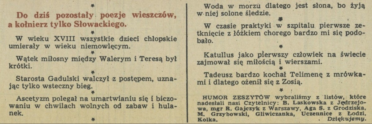 Archiwum / Humor zeszytów szkolnych nr 1277 (39/1969) 12/409 Podziel się Tytuł Humor z zeszytów Rubryka Humor zeszytów szkolnych Artykuł z numeru 1277 (39/1969) Data wydania 28 września 1969 Tagi humor z zeszytów