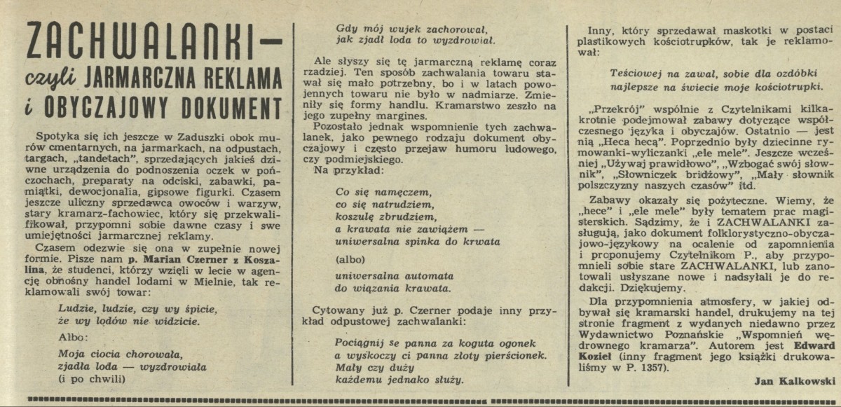Archiwum / Reklamy nr 1386 (44/1971) 03/14 Podziel się Tytuł Zachwalanki - czyli jarmarczna reklama i obyczajowy dokument Autor Jan Kalkowski Rubryka Reklamy Artykuł z numeru 1386 (44/1971) Data wydania 31 października 1971 Tagi Marian Czerner zachwalanki reklama