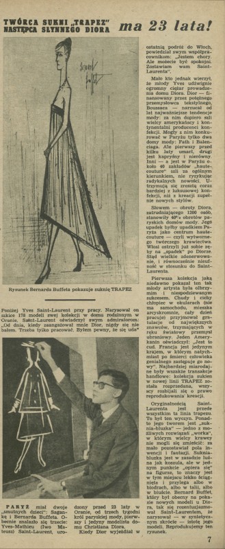 Archiwum / Moda nr 673 (09/1958) 27368/123969 Podziel się Tytuł Twórca sukni „trapez” następca słynnego Diora na 23 lata! Kategoria Moda Artykuł z numeru 673 (9/1958) Data wydania 2 marca 1958 Tagi Saint-Laurent Dior