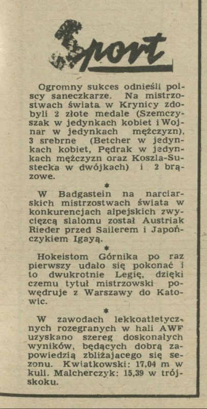 Archiwum / Sport nr 670 (06/1958) 27195/123969 Podziel się Tytuł Sport Rubryka Sport Artykuł z numeru 670 (6/1958) Data wydania 9 lutego 1958
