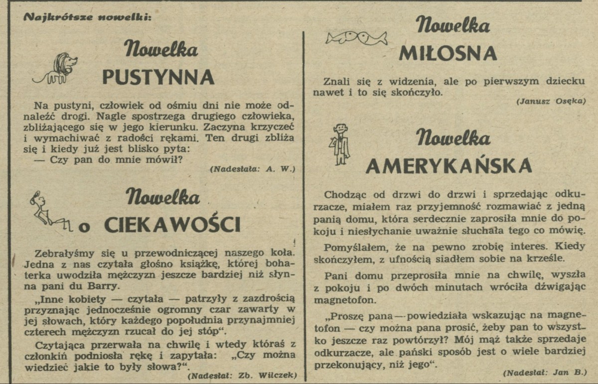 Archiwum / Najkrótsze nowelki nr 670 (06/1958) 05/49 Podziel się Tytuł Najkrótsze nowelki Rubryka Najkrótsze nowelki Artykuł z numeru 670 (6/1958) Data wydania 9 lutego 1958 Tagi nowelka pustynna nowelka o ciekawości nowelka miłosna nowelka amerykańska