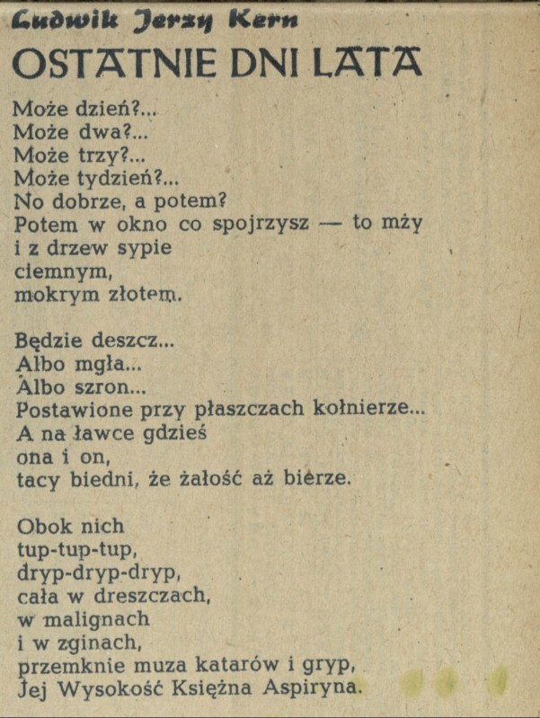 Archiwum / Poezja nr 703 (39/1958) 37/52 Podziel się Tytuł Ostatnie dni lata Autor Ludwik Jerzy Kern Kategoria Poezja Artykuł z numeru 703 (39/1958) Data wydania 21 września 1958