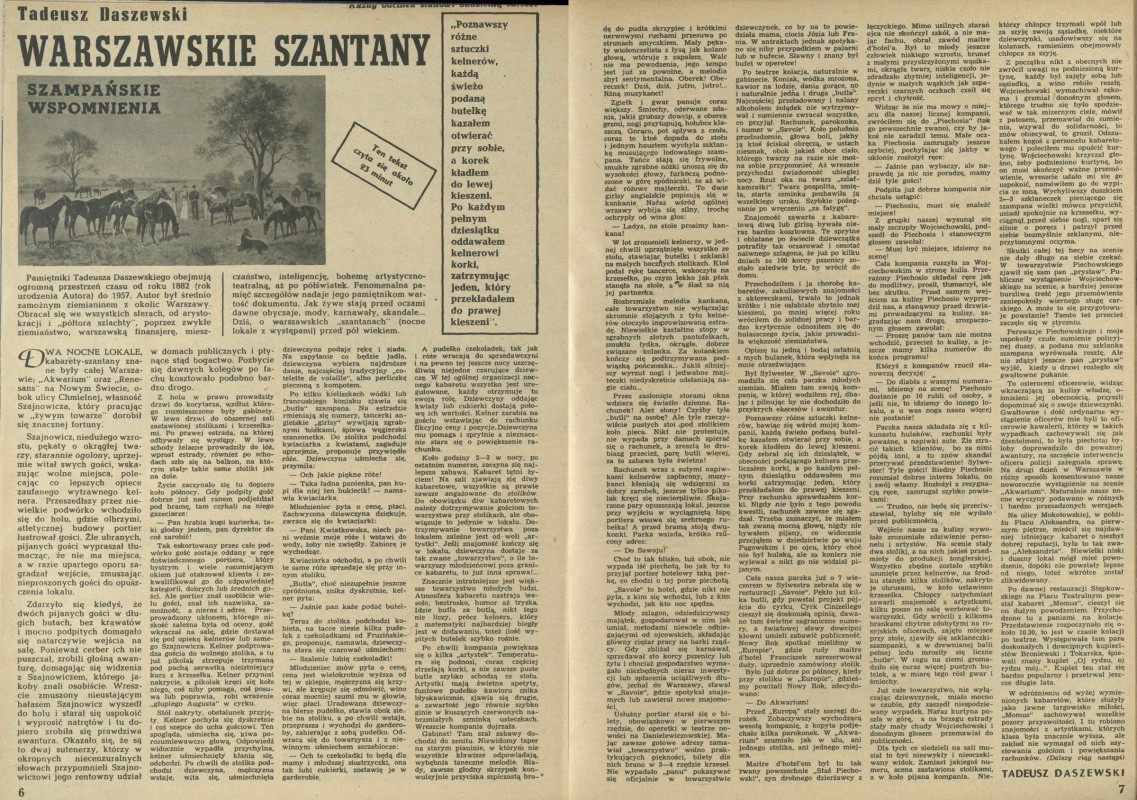 Archiwum / Proza nr 680 (16/1958) 12/25 Podziel się Tytuł Warszawskie szantany Autor Tadeusz Daszewski Kategoria Proza Artykuł z numeru 680 (16/1958) Data wydania 20 kwietnia 1958