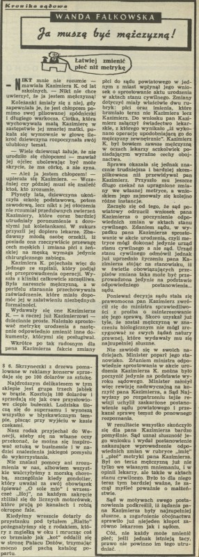 Archiwum / Kronika sądowa nr 1020 (43/1964) 32/64 Podziel się Tytuł Ja muszę być mężczyzną! Autor Wanda Falkowska Rubryka Kronika sądowa Artykuł z numeru 1020 (43/1964) Data wydania 25 października 1964 Tagi kronika sądowa zmiana płci metryka trans gender Transpłciowość