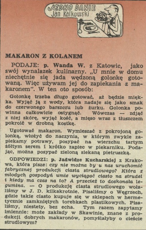 Archiwum / Jedno danie nr 1182 (49/1967) 18/169 Podziel się Tytuł Makaron z kolanem Autor Jan Kalkowski Rubryka Jedno danie Artykuł z numeru 1182 (49/1967) Data wydania 3 grudnia 1967