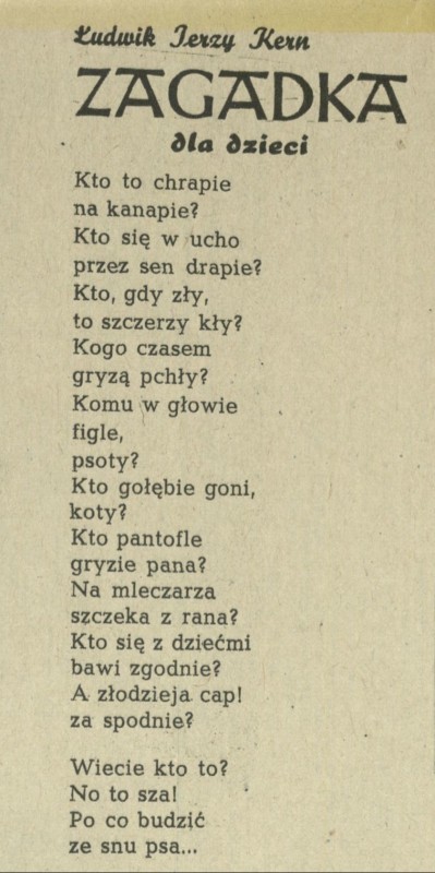 Archiwum / Łamigłówki Przekroju nr 693 (29/1958) 53/101 Podziel się Tytuł Zagadka dla dzieci Autor Ludwik Jerzy Kern Rubryka Łamigłówki Przekroju Artykuł z numeru 693 (29/1958) Data wydania 20 lipca 1958 Tagi zagadka zgadywanka łamigłówka wiersz