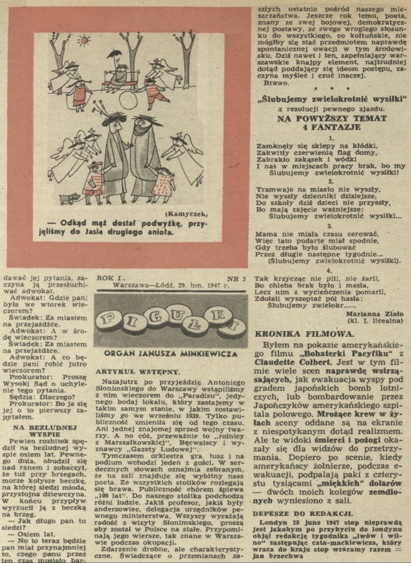 Archiwum / Pigułki - organ Janusza Minkiewicza nr 116 (26/1947) 09/47 Podziel się Tytuł Pigułki - organ Janusza Minkiewicza Autor Janusz Minkiewicz Rubryka Pigułki - organ Janusza Minkiewicza Artykuł z numeru 116 (26/1947) Data wydania 29 czerwca 1947 Tagi satyra Antoni Słonimski ślubujemy zwielokrotnić wysiłki "Bohaterki Pacyfiku" Claudette Colbert