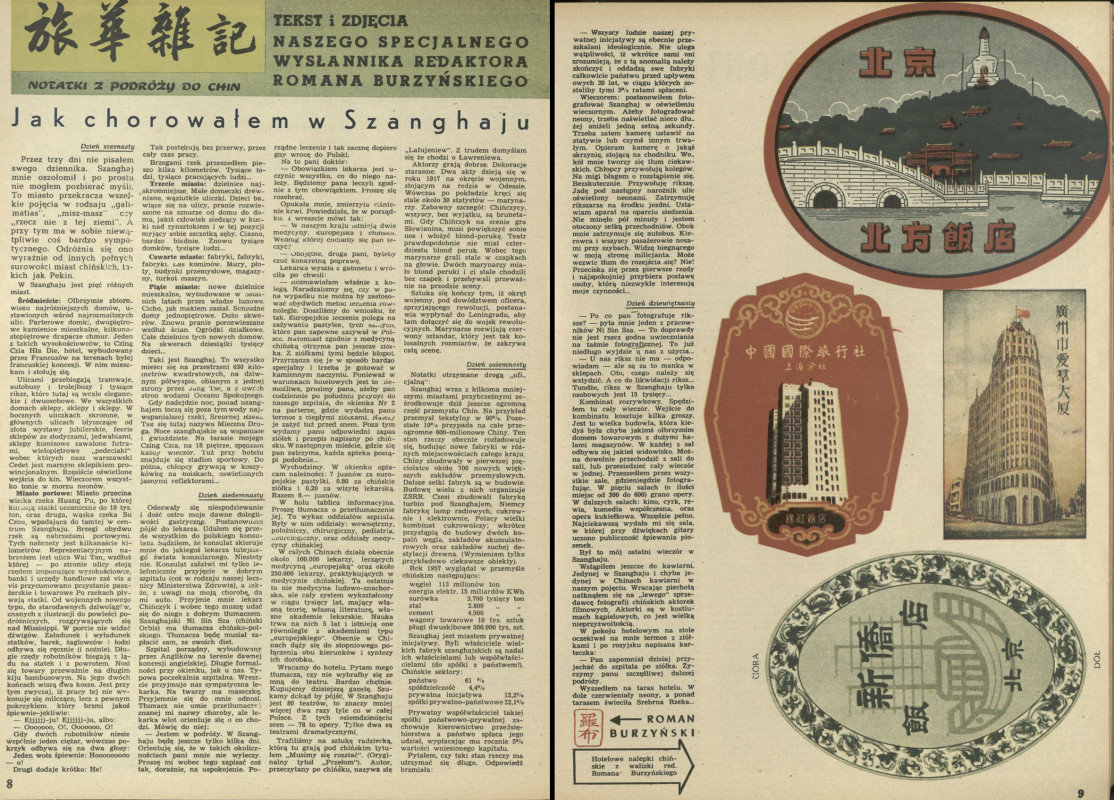 Archiwum / korespondencja własna "Przekroju" nr 683 (19/1958) 3/3 Podziel się Tytuł Jak chorowałem w Szanghaju Autor Roman Burzyński Rubryka korespondencja własna "Przekroju" Artykuł z numeru 683 (19/1958) Data wydania 11 maja 1958 Tagi chiny szanghaj