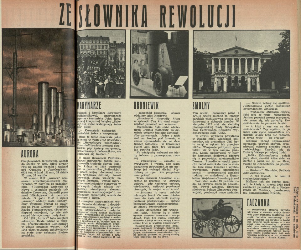 Archiwum / Artykuł nr 1178 (45/1967) 1/1 Podziel się Tytuł Ze słownika rewolucji Kategoria Artykuł Artykuł z numeru 1178 (45/1967) Data wydania 5 listopada 1967 Tagi okręt Daleki Wschód Aurora samochód pancerny