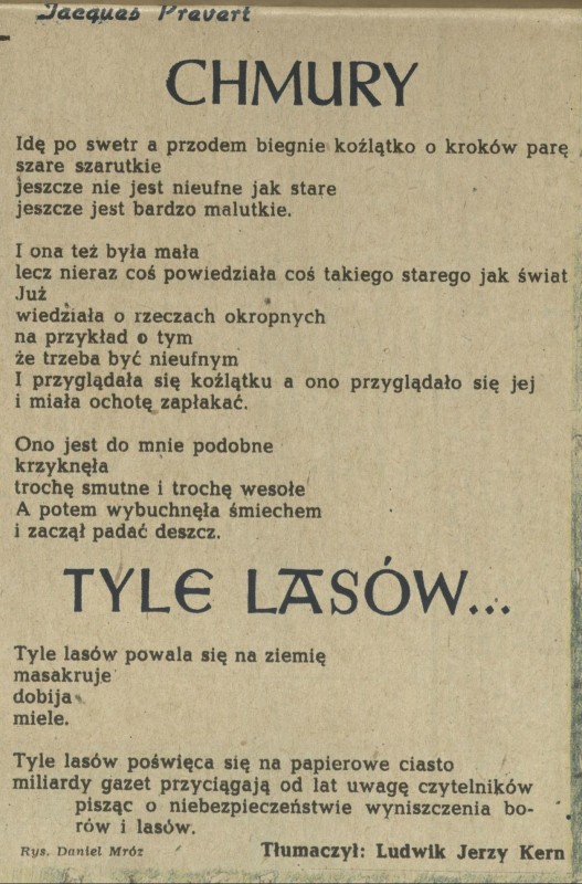 Archiwum / Poezja nr 673 (09/1958) 8/8 Podziel się Tytuł Chmury, Tyle lasów Autor Jacques Prevert Kategoria Poezja Artykuł z numeru 673 (9/1958) Data wydania 2 marca 1958